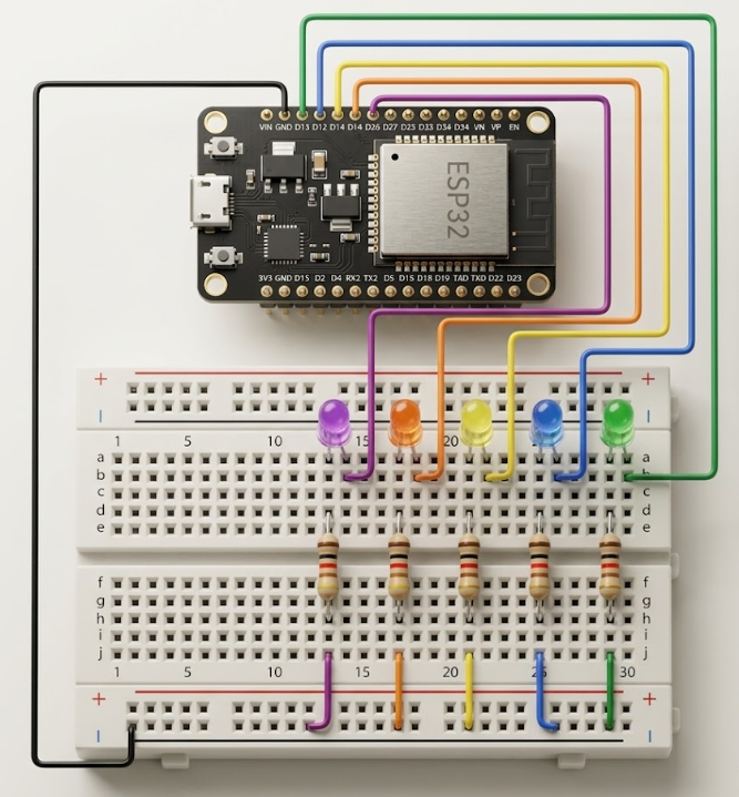 This tutorial shows how to create a classic LED chaser (running light) using ESP32 and Arduino. You will learn the hardware wiring, program structure, and several ways to implement the effect, including a more concise version using arrays and loops.